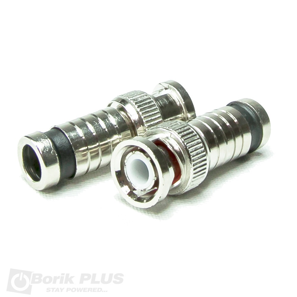 Konektor BNC kompresioni muski sa pinom za kabal RG 59. Izuzetno cvrst spoj kabla i konektora. Za montazu su potrebna i posebna kompresiona klesta. Koristi se u sistemima video nadzora za povezivanje kamere i DVR-a. Ovaj kompresioni BNC konektor ostvaruje odlican i cvrst spoj sa nasim RG 59 kablom i ubrzava svaku montazu do maksimuma. Jednostavno blankiranje sa nasim striperom i kompresija sa nasim kompresionim klestima, olaksace vam rad.