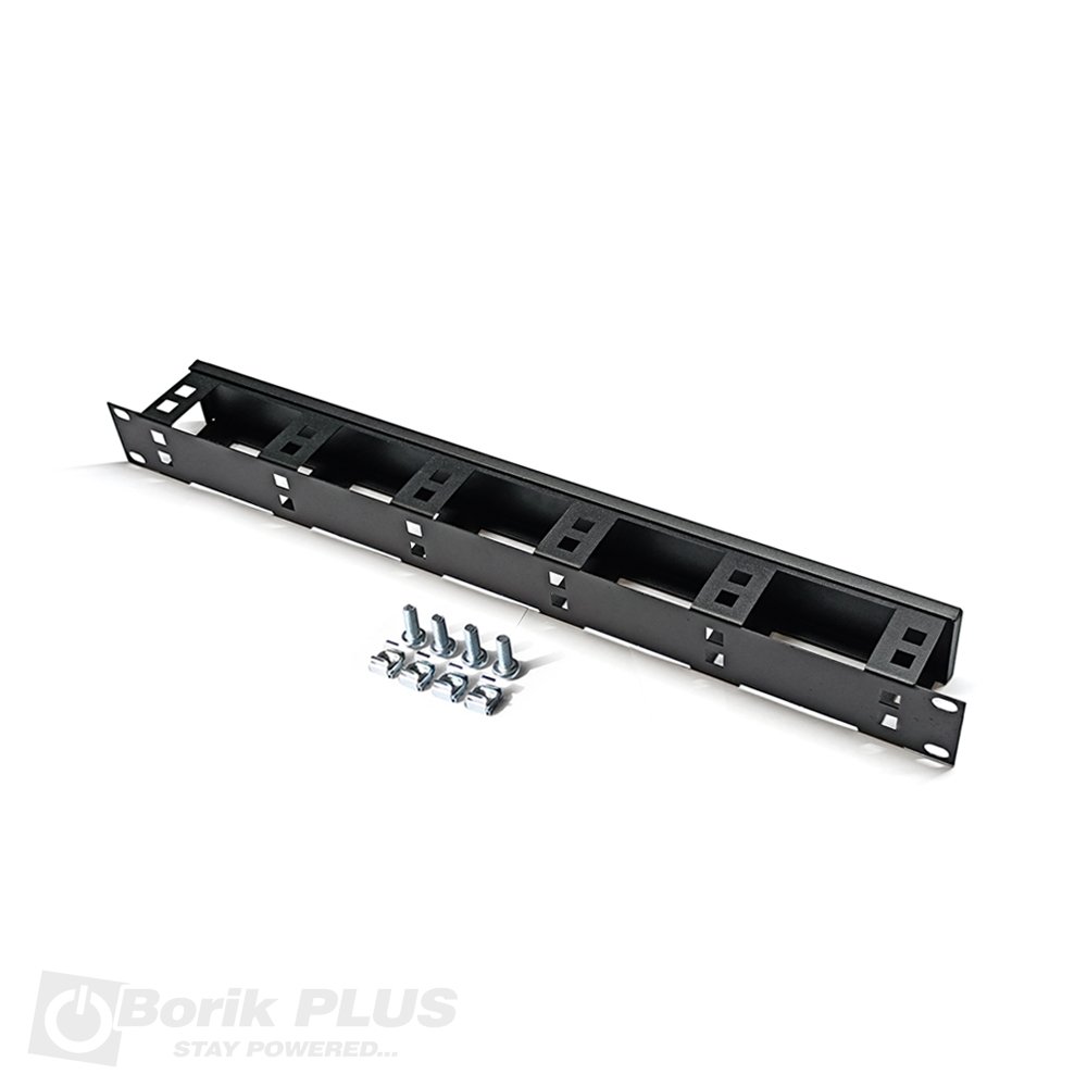 Horizontalni organizer kablova za rek 19″ CRNI visine 1U. Organizer kablova može da primi oko 30 UTP kablova i poseduje perforiranu platformu za vezivanje kablova kao i poklopac sa zadnje strane. Uz horizontalni organizer kablova dobijaju se i šrafovi za spajanje sa rek ormanom. Horizontalni organizer kablova za rek 19″ CRNI može se po želji i potrebi montirati i na zadnje nosače ako ih REK poseduje. VATPAN proizvođač rek ormana, dubine 600mm poseduju prednje i zadnje nosače.