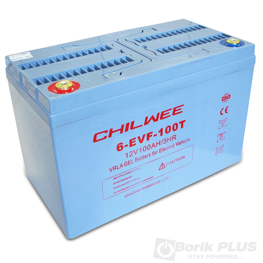 Chilwee 6 EVF 100B olovna GEL baterija namenjena za upotrebu u ciklicnom rezimu. Napravljena za upotrebu u peracima podova na elektro pogon,invalidskim kolicima, vecim solarnim sistemima i drugim ciklicnim aplikacijama. Specijalni silica-gel kao separator dozvoljava upotrebu na nesto visim radnim temperaturama. Moze se montirati u bilo kom polozaju osim naopako. Poboljsana CA formula omogucava veci broj praznjenja i duzu autonomiju u ciklicnoj upotrebi, kao i bolji oporavak iz duboko izpraznjenog stanja.