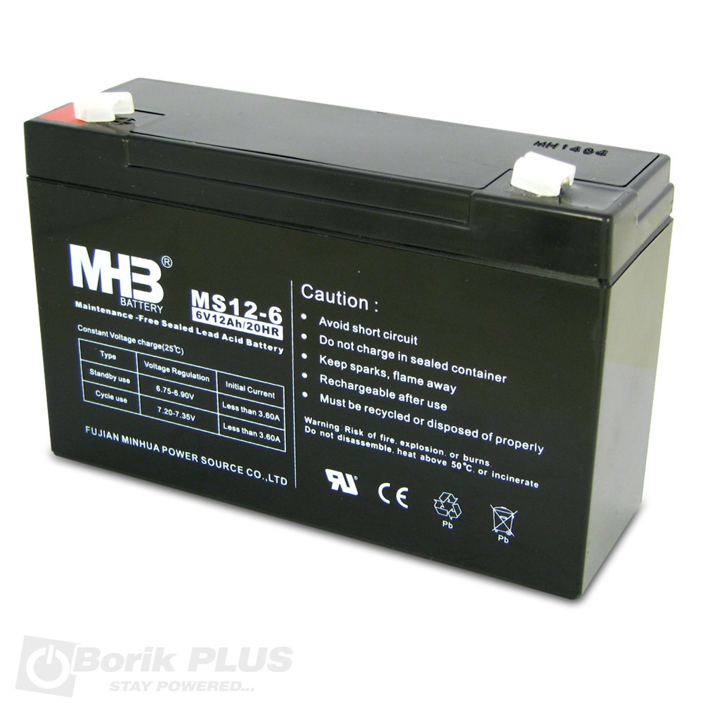 MHB olovna VRLA AGM baterija MS 12-6. Napravljena za upotrebu u Standby rezimu. Najcesce se koristi u decijim auticima i ponekim modelima UPS uredjaja. Bez odrzavanja. Moze se koristiti i u ciklicnom rezimu ali joj se zivotni vek smanjuje. Moze se montirati u bilo kom polozaju osim naopako. Najbolji odnos cene i kvaliteta je ono u cemu MHB baterije nemaju konkurenciju.