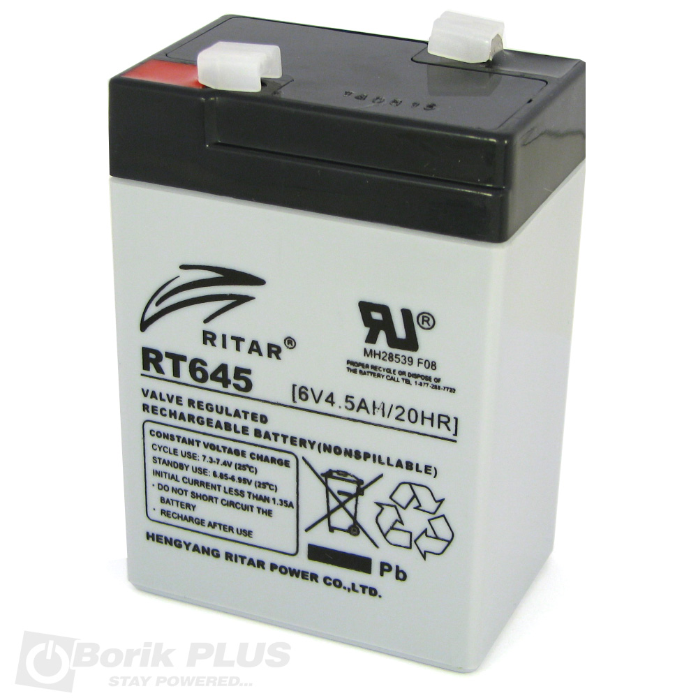 Ritar RT645 olovna VRLA baterija sa klemom F1 (4.8 mm). Idealna za ugradnju u vagama, panik rasveti ili za decije autice na elektricni pogon. Baterija Ritar RT – Standby serije je odlican izbor i za razliku od ostalih brendova ova baterija bolje podnosi nesto vece napone punjenja koji se mogu javiti u nekontrolisnim uslovima za razliku od UPS uredjaja. Zivotni vek Ritar baterija zbog specijalne poboljsane legure olovnih resetaka sa sadrzajem Kalcijuma iznosi od 6 do 8 godina.