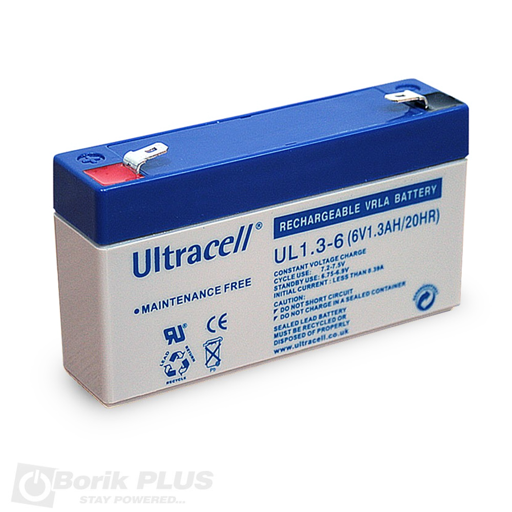 Ultracell UL 1.3-6 olovna VRLA baterija sa klemom F1 ( 4.8 mm ). Idealna za ugradnju u odredjenim modelima fiskalnih vaga i kasa zbog male kleme. Najpopularnija kod firmi koje se bave ugradnjom i odrzavanjem POS sistema i biro-opreme. Nije preporuka za ugradnju u UPS uredjajima.