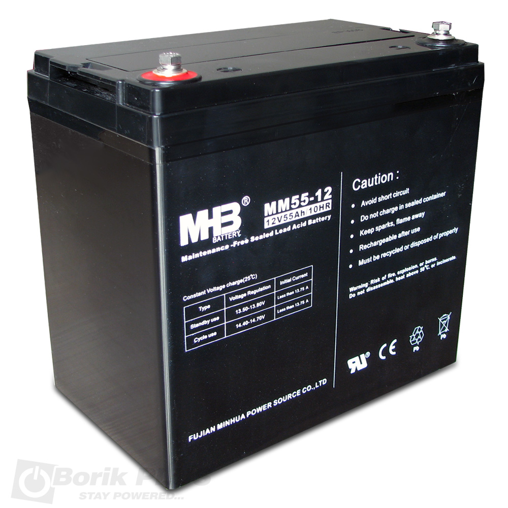 MHB olovna VRLA AGM baterija MM 55-12. Napravljena za upotrebu u Standby rezimu kao podrska glavnom napajanju. Najcesce se upotrebljava u UPS sistemima, u velikim sistemima za dojavu pozara i ostalim sigurnosnim sistemima. Moze se koristiti i u ciklicnom rezimu ali joj se zivotni vek drasticno smanjuje. Iako po dimenzijama odgovara nije za upotrebu u invalidskim kolicima. Moze se montirati u bilo kom polozaju osim naopako. Najbolji odnos cene i kvaliteta je ono u cemu MHB baterije nemaju konkurenciju. Bateriju istih dimenzija ali od drugog proizvodjaca pogledajte ovde.