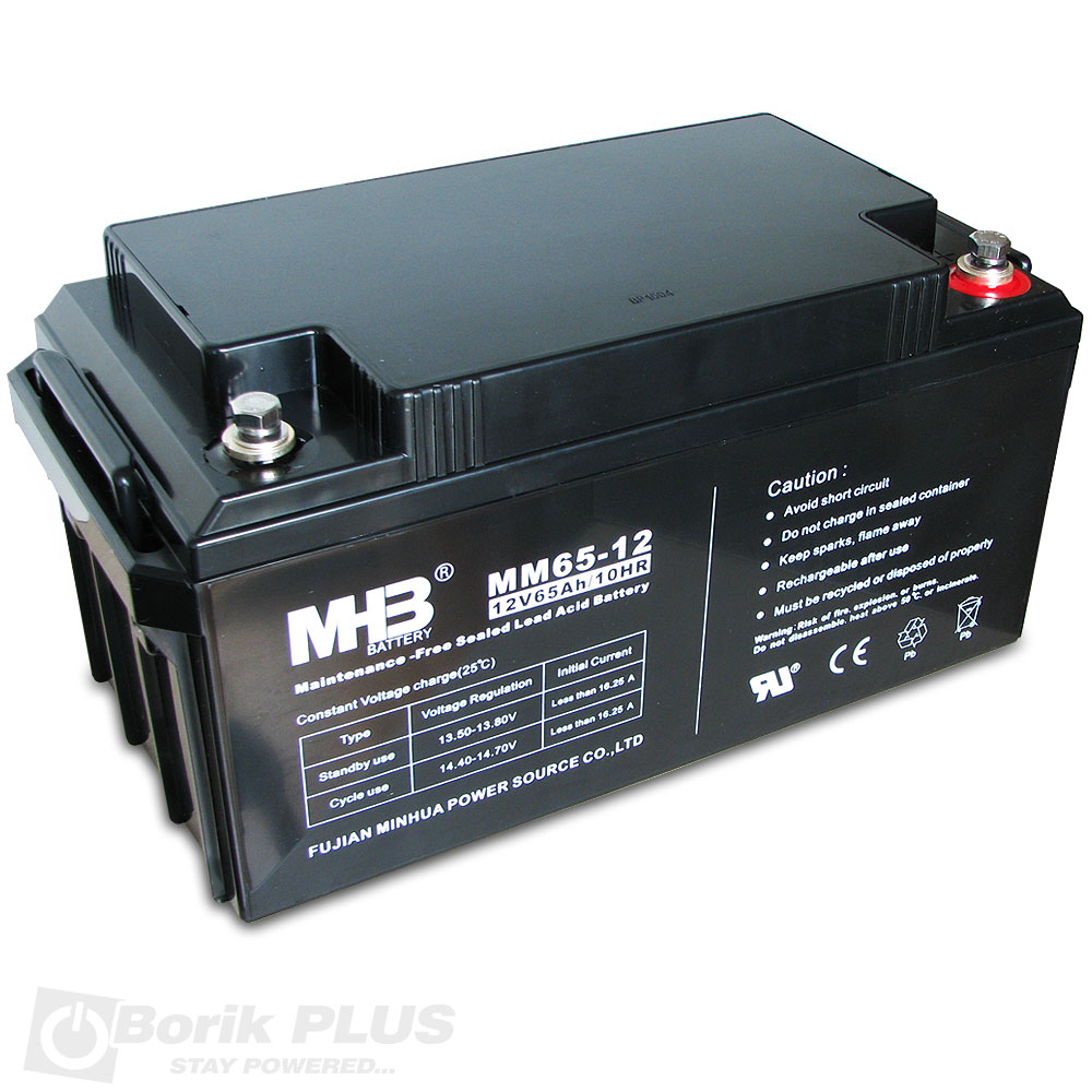 MHB olovna VRLA AGM baterija MM 65-12. Napravljena za upotrebu u Standby rezimu kao podrska glavnom napajanju. Najcesce se upotrebljava u UPS sistemima, u velikim sistemima za dojavu pozara i ostalim sigurnosnim sistemima. Takodje se upotrebljava u velikim UPS sistemima kao i u manjim UPS- inverterskim sistemima. Moze se koristiti i u ciklicnom rezimu ali joj se zivotni vek drasticno smanjuje. Iako po dimenzijama odgovara nije za upotrebu u invalidskim kolicima. Moze se montirati u bilo kom polozaju osim naopako. Najbolji odnos cene i kvaliteta je ono u cemu MHB baterije nemaju konkurenciju.