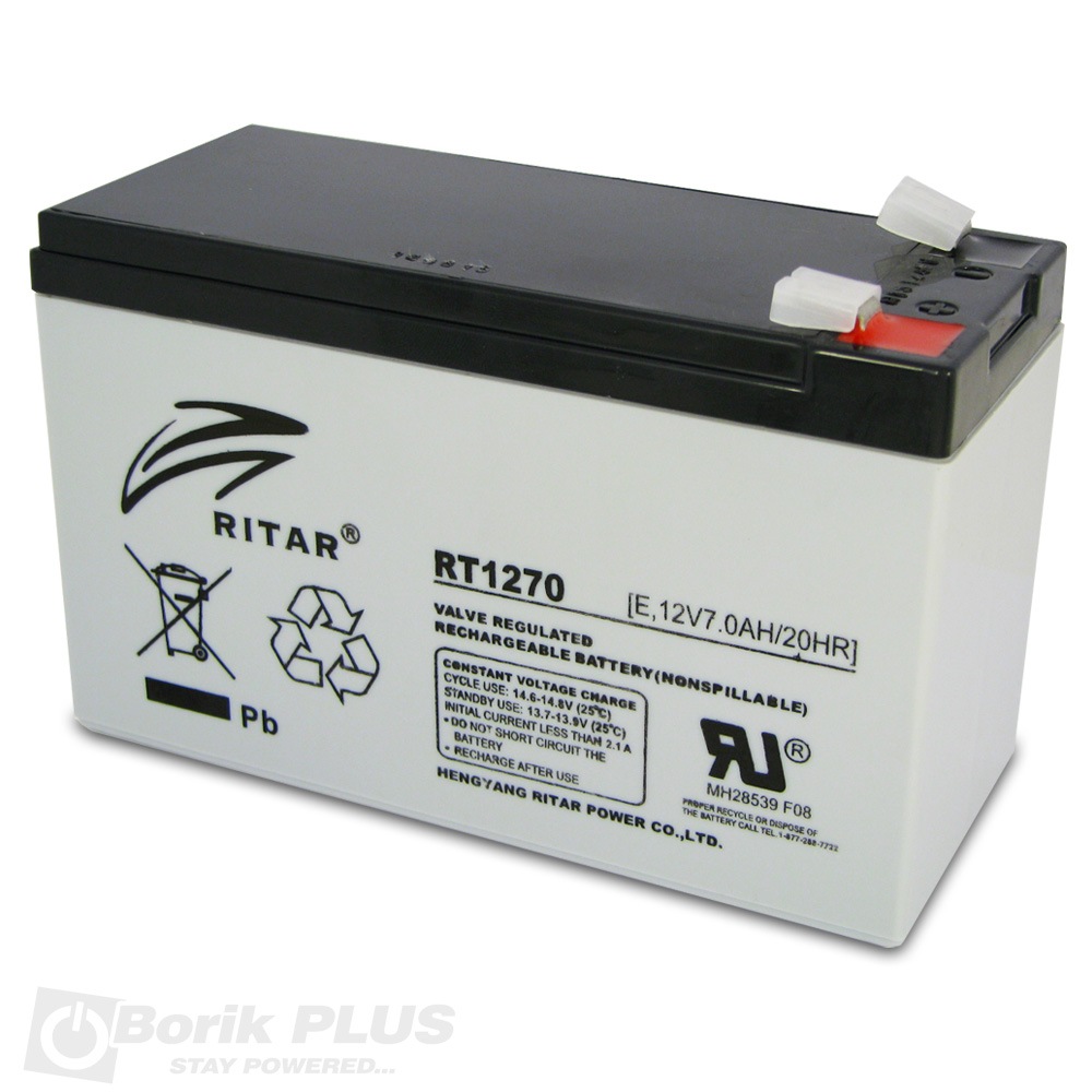 Ritar RT1270 olovna VRLA baterija sa klemom F2 (6.3 mm). Idealna za ugradnju u UPS sistemima. Baterija Ritar RT-Standby serije je odličan izbor jer za razliku od ostalih brendova ova baterija bolje podnosi nešto veće napone punjenja koji se mogu javiti kod određenih modela UPS uređaja. Životni vek Ritar baterija zbog specijalne poboljšane legure olovnih rešetaka sa sadržajem Kalcijuma iznosi od 6 do 8 godina. Stranicu proizvođača za ovaj proizvod pogledajte ovde. Bateriju istih karakteristika od drugog proizvođača možete pogledati ovde.