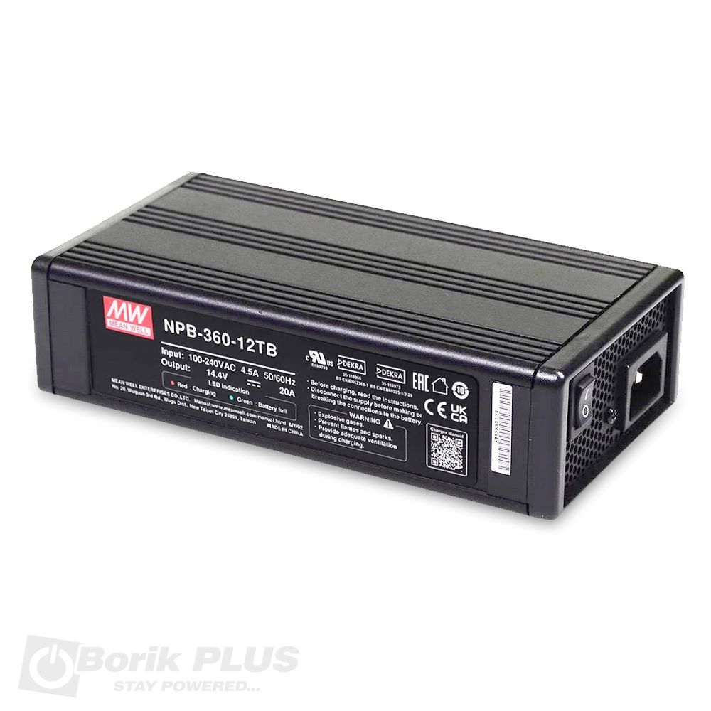 Punjač olovnih VRLA baterija i baterija na bazi Litijuma, proizvođača MEANWELL je vrhunskog kvaliteta i pouzdanosti. NPB-360-12TB je profesionalni punjač koji mogu koristiti samo stručni ljudi iz razloga što neadekvatnim odabirom parametara može lako upropastiti bateriju. NPB-360-12TB punjač dozvoljava da ograničimo struju punjenja od 50% do 100% deklarisane snage. Meanwell je svetski poznat brend sa dugogodišnjom tradicijom. Punjač se nalazi u robusnom aluminijumskom kućištu BEZ forsiranog vazdušnog hlađenja i bez ventilatora. Poseduje indikacione lampice koje pokazuju status punjenja. Punjač je potpuno automatski sa pametnim trostepenim/dvostepenim punjačem koji nakon što bateriju napuni prelazi u mod za održavanje baterija. Ponuđeni model na kraju oznake modela poseduje i oznaku TB što znači da se prodaje BEZ konektora za bateriju i BEZ napojnog kabla. Napojni kabl možete dokupiti ovde.