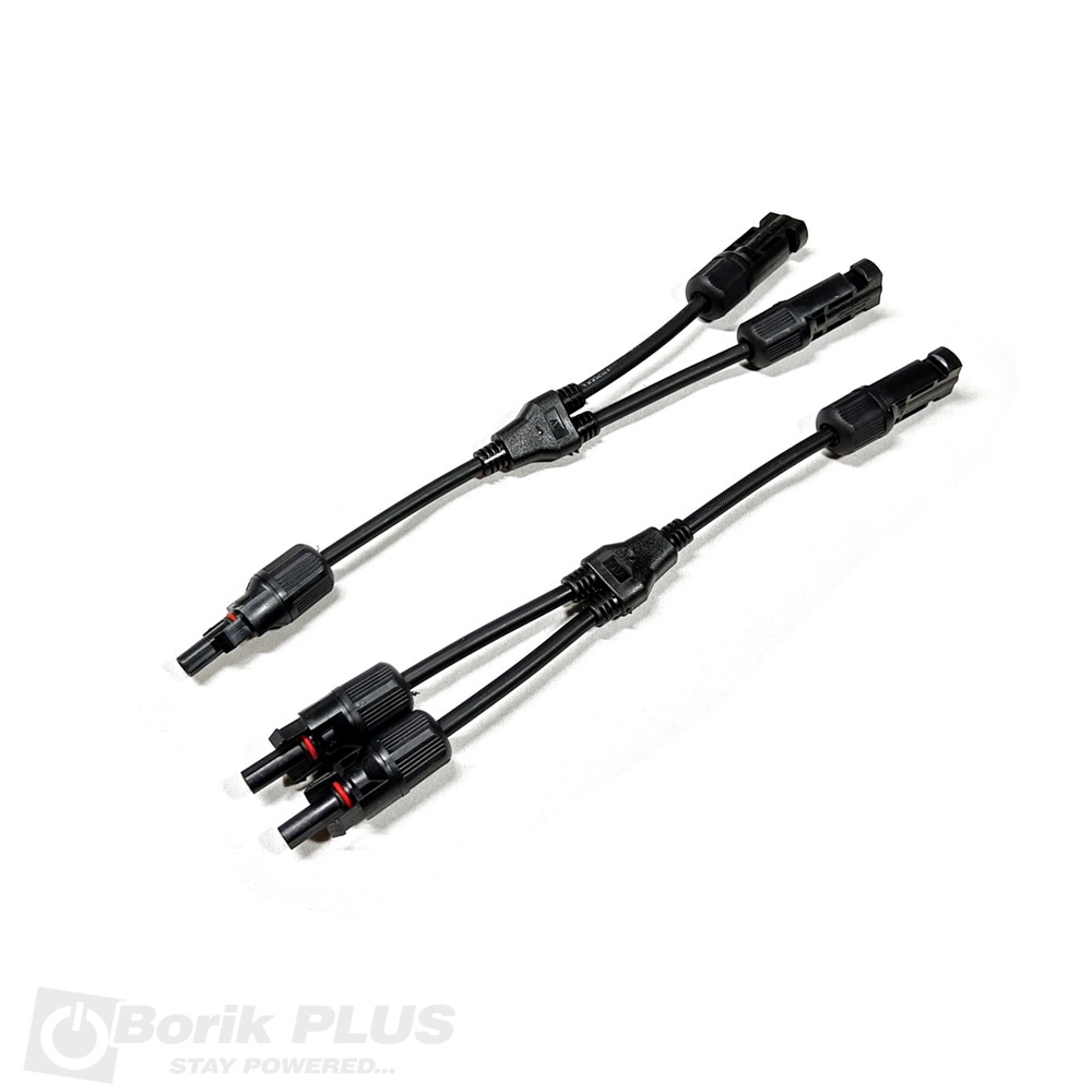 MC4 2T konektor za solarne panele sa kablom sluzi za povezivanje fotonaponskih solarnih panela u paralelnu vezu. Za razliku od običnog MC4 2T konektora ovi su nešto većih dimenzija i imaju kabl te se mogu savijati do određene mere. Prodaju se u paru. Uz pomoc jednog para konektora moguce je povezati dva panela paralelno. Pored ovog konektora potreban vam je i jedan par MC4 konektora kako bi ste ceo sitem povezali sa Vasim kontrolerom ili inverterom. Ovi konektori poseduju i zaštitnu silikonsku gumicu koja onemogućava prodor vode i prašine unutar konektora.