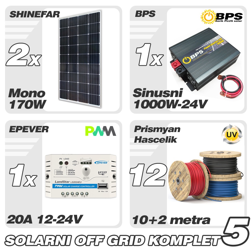 Solarni fotonaponski komplet za proizvodnju električne energije. Komplet broj 5, sadrži sve potrebne komponente osim baterija, za napajanje manjeg objekta sa minimalnim potrošačima preko vikenda. Nazivni napon ovog kompleta je 24V. Komplet sadrži dva Monokristalna solarna panela 170W, DC struja iz panela koja se proizvede prolazi kroz kontroler solarnog punjenja Epever LS2024AU. Akumulirana energija se smešta u dve baterije kapaciteta do 150Ah (baterije nisu uključene u cenu). Uz ovaj solarni komplet dobijate i jedan par MC4 konektora za povezivanje panela sa kontrolerom kao i kratku vezu za povezivanje baterija na red. Neki od potrošača koje ovaj sistem može da opsluži su: Manji frižider A klase, LCD ili LED televizor, LED osvetljenje, laptop računar, punjače za mobilni telefon, radio i druge potrošače male angažovane snage. Sve gore napisano važi isključivo u letnjem periodu. U ovom kompletu dobijate i pravi UV otporni kabl od 4mm2 kojim povezujete panele sa kontrolerom, kao i običan bakarni licnasti kabl od 6mm2 za povezivanje baterija sa kontrolerom. Pokušajte da kablovi budu što kraći jer DC struja ima gubitke na dužim relacijama. Inverter i baterija se povezuju sa debljim kablom koji dobijate uz inverter. Za ovaj sistem možemo ponuditi i nosače za krovnu ili montažu za ravne površine koji nisu uračunati u cenu. Više informacija o položaju Sunca i proizvodnji električne energije solarnim panelima pročitajte ovde.