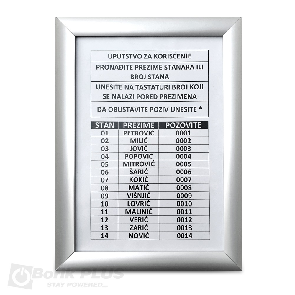 Teh-Tel aluminijumski ram za spisak stanara za papir A4 veličine. Sadrži i uputstvo za pozivanje korisnika i ima spisak stanara sa brojevima stanova i šiframa unesenim u intefronsku jedinicu. Dimenzije lista unutar rama su A4 formata (210 × 297 mm) i lako se postavlja i menja. Koristi se za Teh-Tel sisteme Q2, Smart i MobTeh.