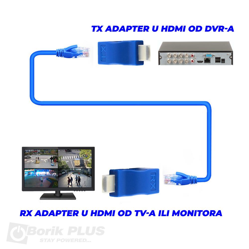 ZBOG NEDOZVOLJENOG NAPONA KOJI NEKI KABLOVSKI PROVAJDERI PUŠTAJU KROZ SVOJE RISIVERE/RUTERE, OVAJ HDMI EKSTENDER NE KORISTITI ZA PRENOS SLIKE OD RISIVERA/RUTERA DO TV-A VEĆ ISKLUČIVO U ZATVORENIM SISTEMIMA VIDEO NADZORA OD DVR ILI NVR UREĐAJA DO MONITORA ILI TV-A. HDMI ekstender pasivni za prenos HDMI signala na razdaljini od najviše 30 metara pomoću jednog UTP kabla. UTP, FTP ili SFTP kabl mora biti jako kvalitetan a parice moraju biti od bakra. Ovaj model ekstendera prenosi sliku bez potrebe za dodatnim napajanjem. HDMI ekstender se sastoji od TX dela koji ide u DVR-a i RX dela koji ide u monitor ili TV. Zamenom TX ili RX pri puštanju u rad može doci do spaljivanja ekstendera. Podržava 1080 P, 3D i 4K rezoluciju. Najčešće se koristi kod sistema video nadzora gde je sa DVR-a potrebno preneti sliku na neku udaljenu lokaciju gde je monitor. Odličnog kvaliteta bez kabla. Preporučujemo da pročitate savete i iskustva za povezivanje HDMI ekstendera ovde.