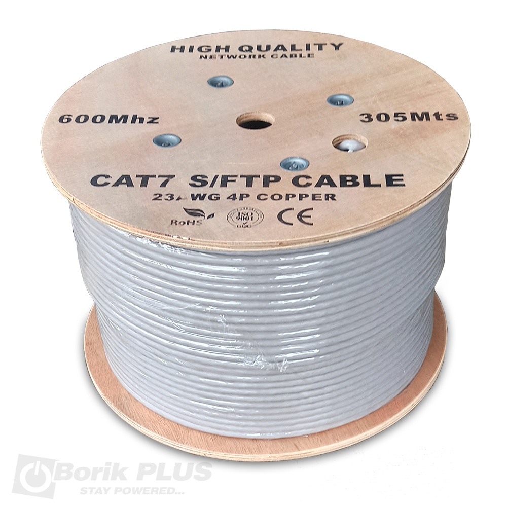 PRIKAZANA CENA JE ZA PAKOVANJE OD 305M. Ovaj S/FTP kabl ne prodajemo na metar. Kabl je upakovan na “drum” tj. drveni kotur. Poprečni presek žice jedne parice je pun a ne licnasti i namenjen je za ugradnju u zid. Materijal žice je od čistog bakra (CU). Prikazana slika je prava slika kabla. Razlika između S/FTP i FTP kabla je ta što su kod FTP kabla sve 4 parice (osam žica) obmotane aluminijumskom i celofanskom folijom i štite parice od elektromagnetskog uticaja drugog kabla ili kablova u blizini, dok su kod S/FTP svaka parica obmotana foliom posebno, a sve parice zajedno obmotane i sa sirmom tj pletenicom. Razlika između CAT5 i CAT6 utp kabla je u tome što je poprečni presek provodnika nešto veći i kod CAT6 kabla postoji separator (izolator) koji odvaja parice. Za direktno krimpovanje CAT7 wall kablova pogledajte poseban konektor na ovom linku. Ispravnost već postavljenog UTP kabla ili raspored žica u nekom od novih ili već postojećih RJ konektora testirajte sa LAN testerom. LAN tester za UTP i FTP kablove iz naše ponude pogledajte ovde.