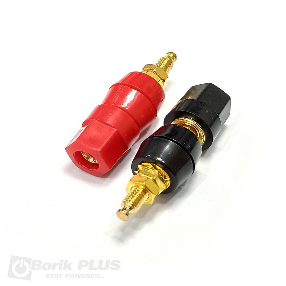 PRIKAZANA CENA JE ZA JEDAN KOMAD. Plastični pozlaćeni konektor za zvučnike. Prodaju se na komad, po jedan crveni i jedan crni konektor. Prikazana cena je za jedan komad. Koristi se za povezivanje kablova od zvučnika sa pojačalon na primer ili kod povezivanja čobanice za čuvanje stoke sa žicom kroz koju prolazi struja.