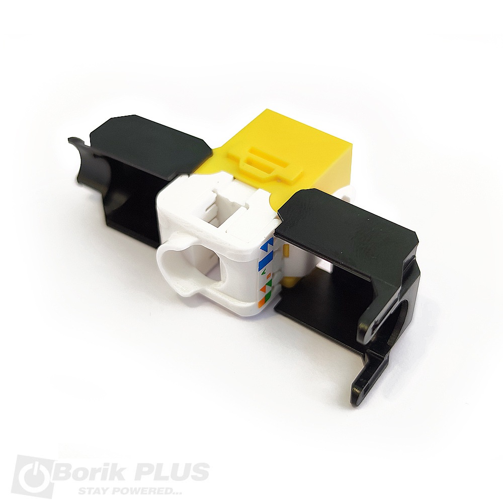 MODUL za RJ 45 konektor kategorije 6A. Jednostavan za montazu bez ikakvog alata zute boje. Na samoj kapici koja se stavlja preko zica, nacrtan je raspored zica kako kod ukrstenog tako i kod ravnog kabla. Poznatiji jos i kao KEYSTONE konektor, vrlo lako se montira a gotov kabl moguce je pricvrstiti vezicom. Kompatibilan sa ALING CONEL modularnim uticnicama.