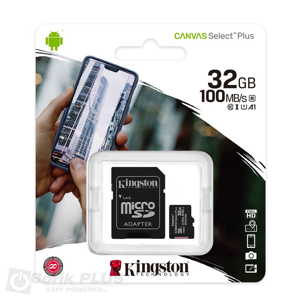 Memorijska kartica Kingston Canvas Select Plus 32GB, 100Mb/s. Kingston Canvas Select Plus microSD je kompatibilan sa Android uređajima i dizajniran je sa A1 performansama. Nudi poboljšanu brzinu i kapacitet za brže učitavanje aplikacija i snimanje slika i video zapisa u više kapaciteta do 512 GB. Moćan u performansama, brzini i izdržljivosti, Canvas Select Plus microSD je dizajniran za pouzdanost prilikom snimanja i razvijanja fotografija visoke rezolucije ili snimanja i uređivanja full HD video zapisa. Kingston Canvas kartice su testirane da budu izdržljive u najtežim okruženjima i uslovima, tako da možete da ih nosite bilo gde sa poverenjem da će vaše fotografije, video snimci i datoteke biti zaštićeni.