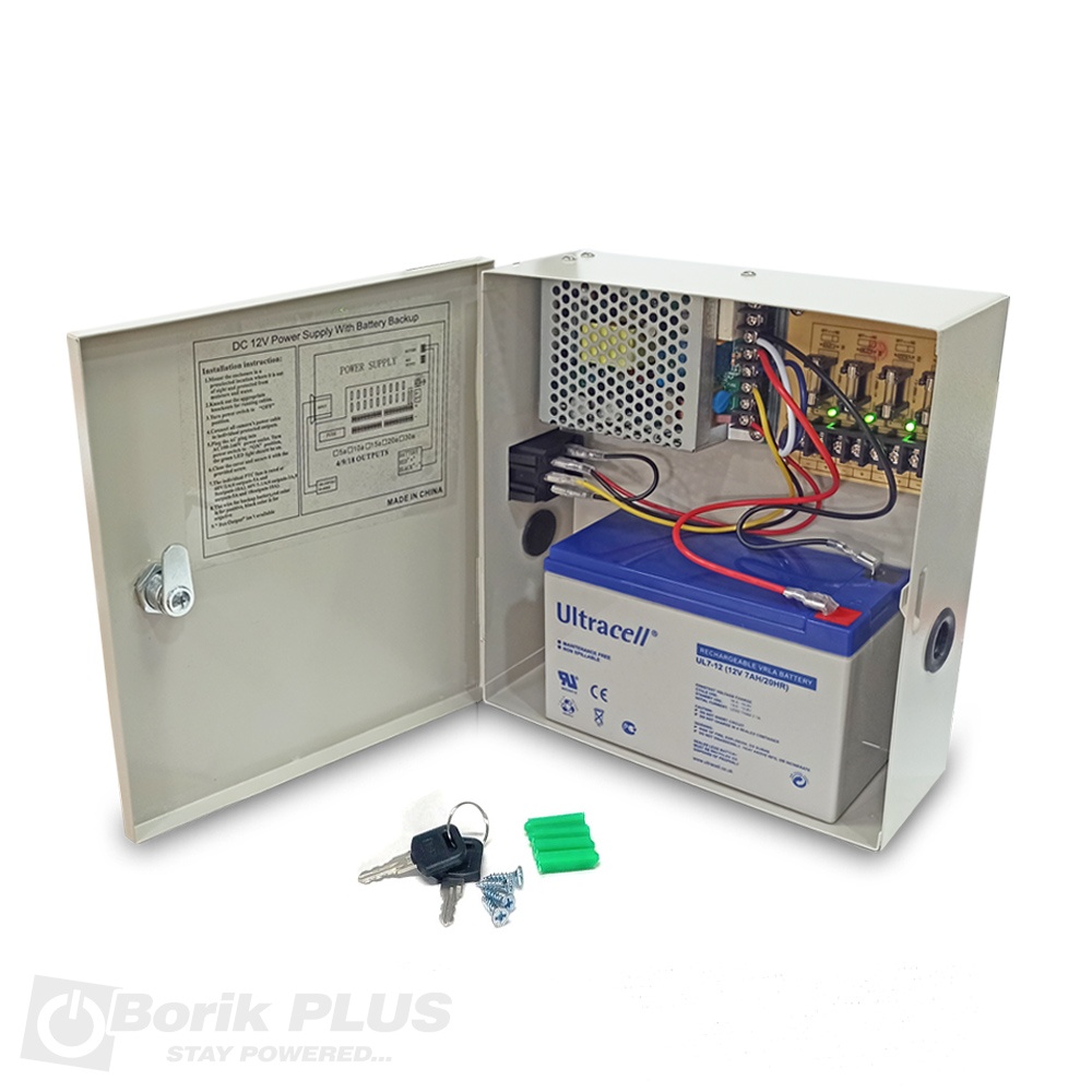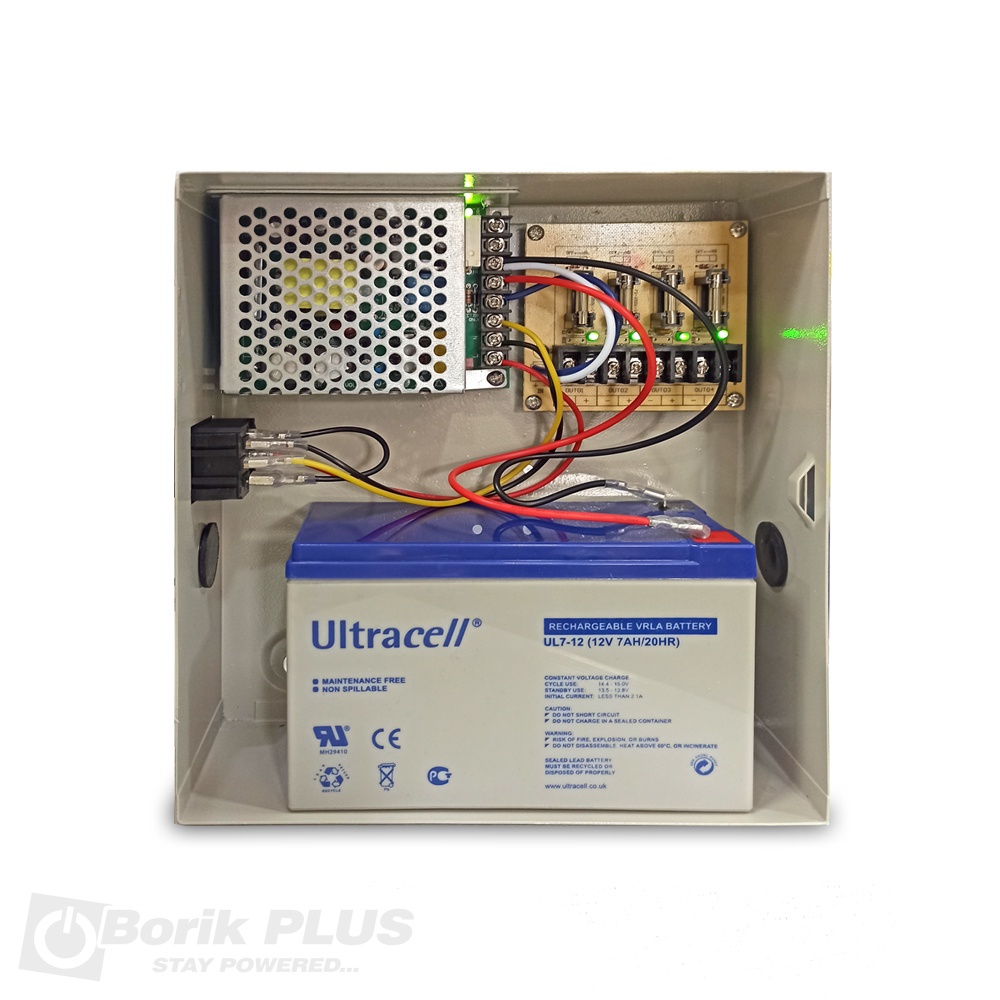 UPS napajanje 12V 5A za CCTV i kontrolu pristupa sa rezervnim napajanjem odnosno baterijom. Baterija nije uključena u cenu. Ono što razlikuje ovo napajanje od Meanwell SCP serije je ustvari i najbitnija odlika ovog napajanja. O tome smo pisali već u blog delu (pogledajte tekst ovde) a odnosi se na napon kojim se puni back up baterija. Ovo stabilisano napajanje ima POTPUNO odvojeno punjenje baterije i korekcijom napona na izlazu ne menja se napon punjenja baterije što je ustvari najbitnije. Druga prednost ovog napajanja je i ta što za razliku od Meanwell SCP serije, ne dozvoljava pražnjenje baterije ispod 9.2V što omogućava da se baterija normalno napuni kada struja ponovo dođe (podsećamo da se baterija sa naponom ispod 7V neće puniti jer je punjač ne vidi zbog preniskog napona). Ovo napajanje ne poseduje klasicne staklene osigurace vec zasebno elektronsko kolo za svaki izlaz, koje se usled kratkog spoja samo gasi i vraca u radni rezim nakon otklanjanja kratkog spoja na toj grani.